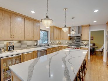 Kitchen Renovation in Bloomington, MN with industria feel.  Quartz countertops, wood countertops