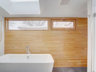 1920s Main Bath Remodel with cherry cabinets and white tile.